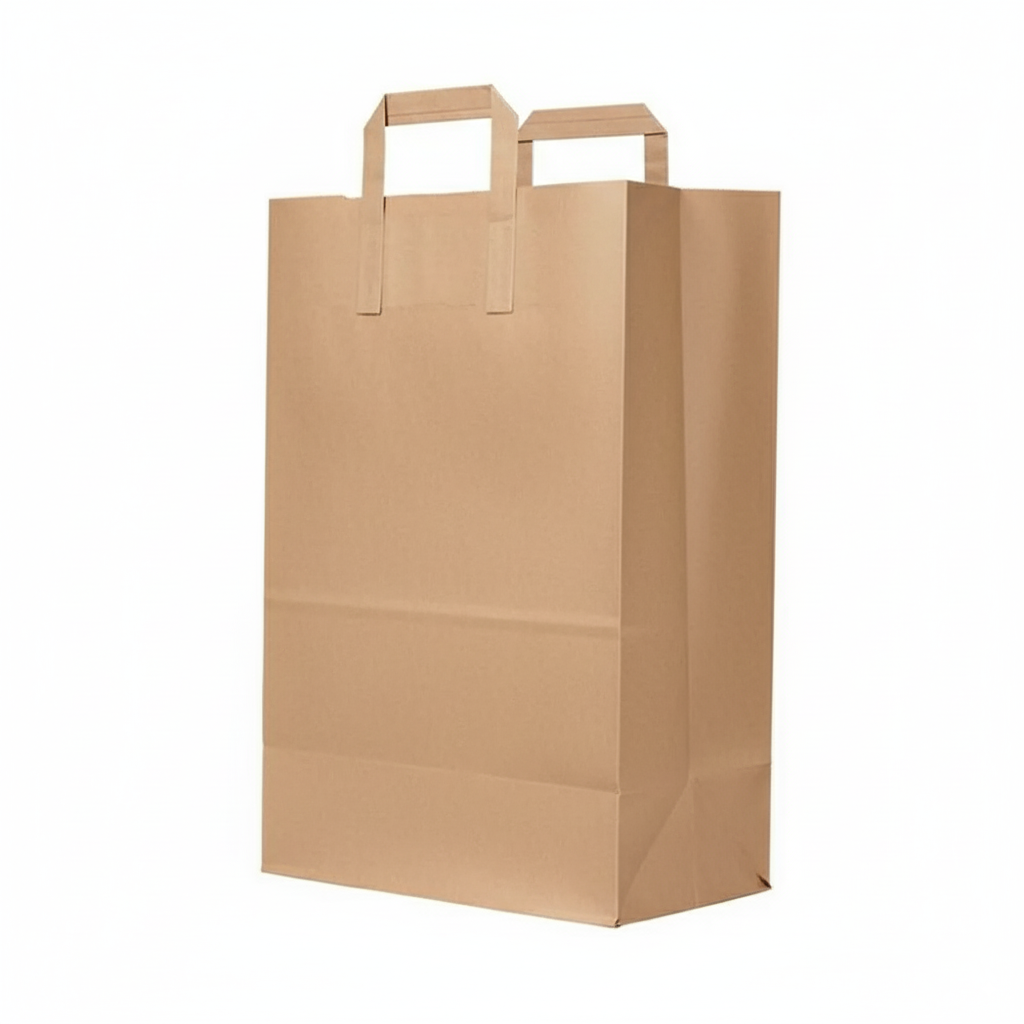 The EP005262 Kraft Flat Handle Paper Bag is a durable and eco-friendly packaging solution designed for retail, food service, and gift packaging. Measuring 12" x 7" x 14" (300 x 350 x 180 mm), this kraft paper bag features flat handles for easy carrying and is made from strong, sustainable materials.
